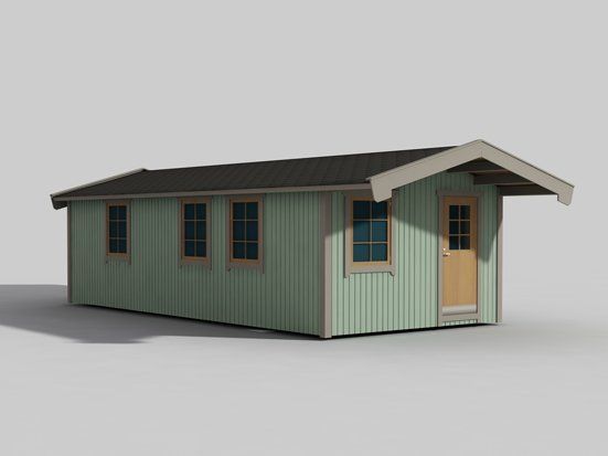 Spesifikasjoner: Bredde: 369cm. Dybde: 808cm. Høyde: 290cm. Dør: 80x185cm. Isolerglass. Vindu 4 stk. 80x100cm kan åpnes. Isolerglass. Vekt: Ca 1700kg fordelt på 3 kolli. Takstørrelse: 45kvm. Takhelning: 16 grader.