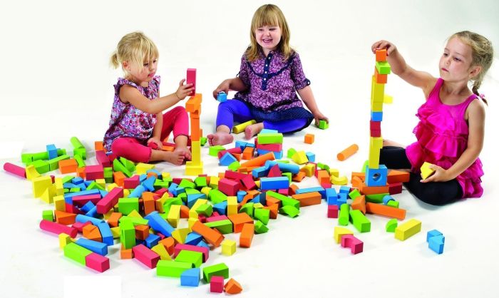 158 stk/pk. Et stort sett med klosser i ulike farger og former for fantasifull bygging. Av EVA, et mykt, stille og behagelig materiale. Bredde ca 3,5 cm. Fra 3 år.