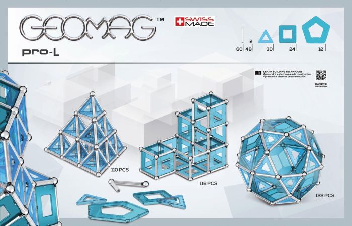 180 deler. Inneholder 60 magnetstaver, 46 kuler, 3 plattformer, 35 trekantede paneler, 25 kvadratiske paneler og 5 pentagoner. Mål på panelene 5,5x5,5 cm, respektive 6,3x6,3 cm, mål på stavene 57 mm. OBS! Ingen magnetisme i kulene. Av PP og ABS plast. Fra 3 år.