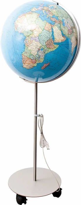 Gulvstående globus med hjul for enkel transportering fra et rom til et annet. Globusen er stor og har en diameter på 51cm. Dette er en veldig oversiktlig globus som viser landegrenser og navn tydelig. Globusen er plassert på en ca. 80 cm. høy fot og kan altså trilles på hjulene. Det fysiske kartet (som vises når lyset i globusen er slått på) informerer om landskap, fjell, sletteland, ørken, havdybder, etc. Det politiske kartet (når lyset i globusen er slått av) viser landegrenser og hvert land/stat i forskjellige farger. Denne globusen - som er håndlaget og påført en akrylkule, viser det autentiske bildet av jordkloden. Navn på engelsk.