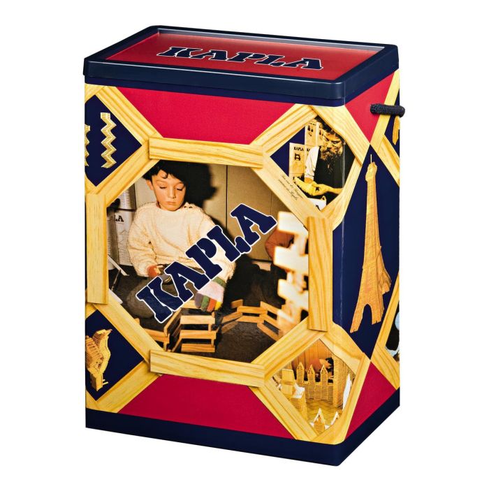 200 Kapla byggestaver i oppbevaringsboks med lokk. Byggeidèer følger med. Stavene er 12 cm lange. Av bjørk. Fra 3 år.