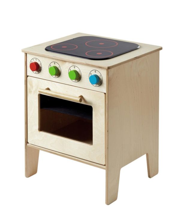 En solid lekekomfyr med ulike funksjoner som platetopp med 3 plater, ovn, bevegelige brytere med tydelige graderinger, dør til å åpne og stekeplate til å ta ut. Høye ben forenkler rengjøring. Av kraftig, lakkert FSC-merket kryssfiner. Leveres ferdig montert. Mål: 40x37x55 cm. Fra 2 år. .