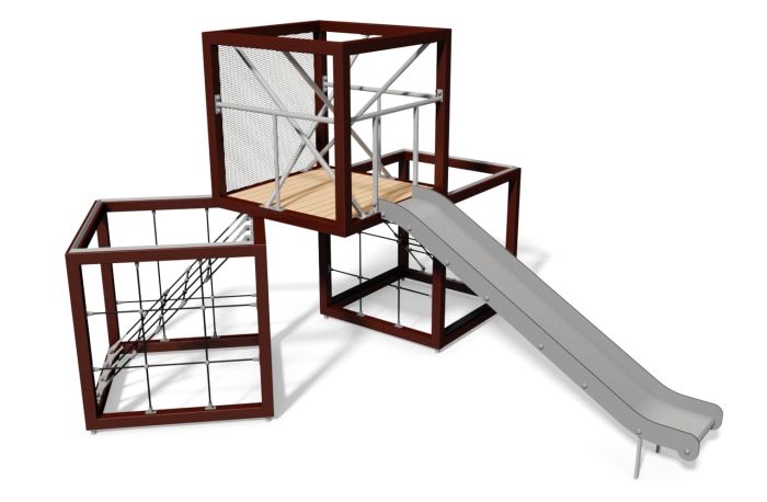 Ett lekeapparat som består av 2 stk firkantet tårn uten plattform, 1 stk firkantet tårn med plattform, sklie, 3 stk vertikale taunett/klatrenett, 2 stk diagonale taunett/klatrenett, 4 stk diagonale stenger og 2 stk horisontale stenger. Velg mellom fargene lys limtre i furu og mørk limtre i furu. Lekeapparatet er sertifisert for bruk på offentlige lekeplasser.