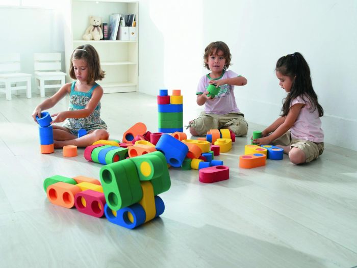 95 myke, fargerike klosser av formpresset skummateriale EVA. Barna trener motorikk og koordinasjon når de bygger og setter sammen klossene med fantasi og kreativitet. Høyde på klossene er 5 cm, minste kloss er Ø5,3 cm, mellomste kloss er Ø8 cm og største klossen er 16 cm lang. Fra 2 år.