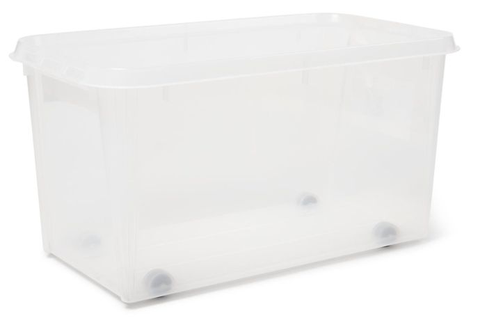 Stor og praktisk oppbevaring med hjul. Rommer 70 liter. Av polypropenplast. Mål: 72x40x39 cm.