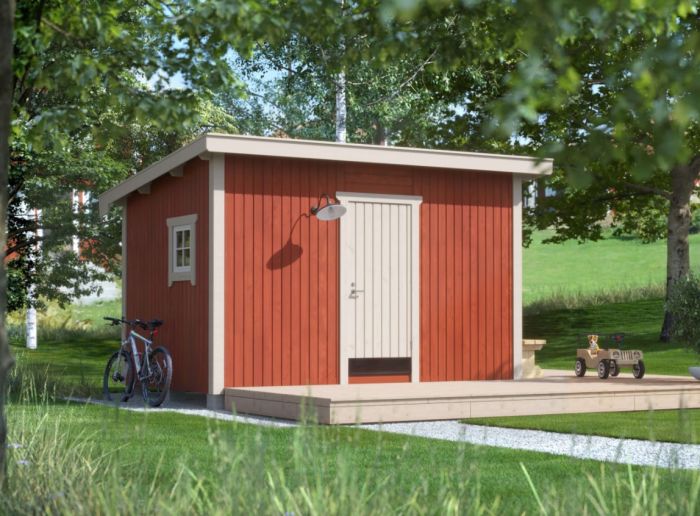 Redskapsbodene er kvalitetsboder som er laget i henhold til sikker nordisk byggetradisjon og som passer fint med de fleste typer bebyggelse. Boden leveres i ferdige seksjoner. Tak, gulvbjelker, takbjelker og bjelkelag er kappet i ferdige lengder. Vindskiver og øvrige detaljer er klare for montering. Samtlige blokker og detaljer er nummerte