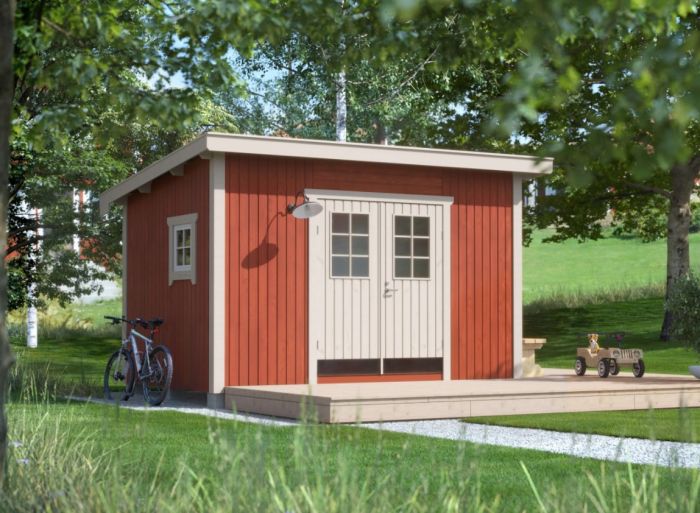Redskapsbodene er kvalitetsboder som er laget i henhold til sikker nordisk byggetradisjon og som passer fint med de fleste typer bebyggelse. Boden leveres i ferdige seksjoner. Tak, gulvbjelker, takbjelker og bjelkelag er kappet i ferdige lengder. Vindskiver og øvrige detaljer er klare for montering. Samtlige blokker og detaljer er nummerte
