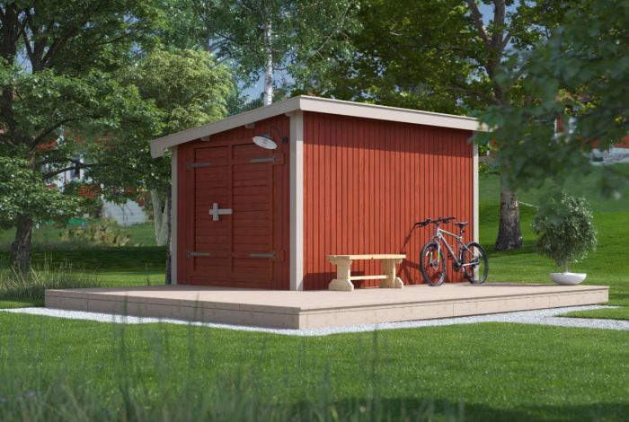 Redskapsbodene er kvalitetsboder som er laget i henhold til sikker nordisk byggetradisjon og som passer fint med de fleste typer bebyggelse. Boden leveres i ferdige seksjoner. Tak, gulvbjelker, takbjelker og bjelkelag er kappet i ferdige lengder. Vindskiver og øvrige detaljer er klare for montering. Samtlige blokker og detaljer er nummerte