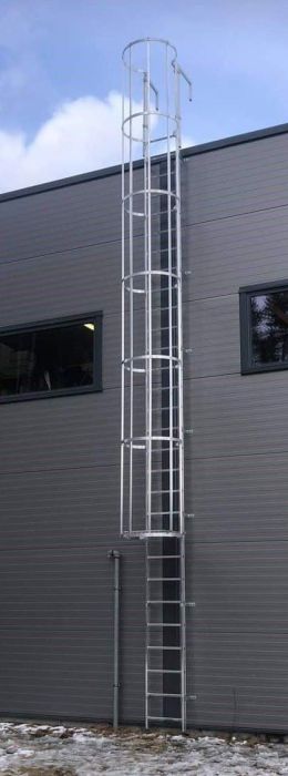 Vi selger ryggvernstiger i alle lengder - be oss om pristilbud. Stigene leveres med kraftige sidevanger med lukket vangeprofil og sklisikre stigetrinn. Ryggbøyler med vertikale ryggskinner gir økt sikkerhet. Leveres med kraftige veggfester. Ryggbøylen skal stikke 1 meter over taket.