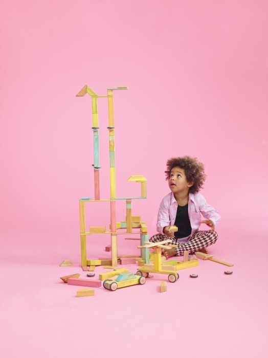 130 deler. Et stort sett med fine magnetiske byggeklosser av tre. Oppmuntrer til en kombinasjon av kreativitet, nysgjerrighet, logisk tankegang, fantasi og barnas sosiale evner. Inneholder hjul, magnetiske klosser og staver i ulike former og farger. Mål på lengste kloss 18x3 cm. Malt med vannbasert giftfri maling. Leveres i oppbevaringsboks av papp. Fra 3 år.